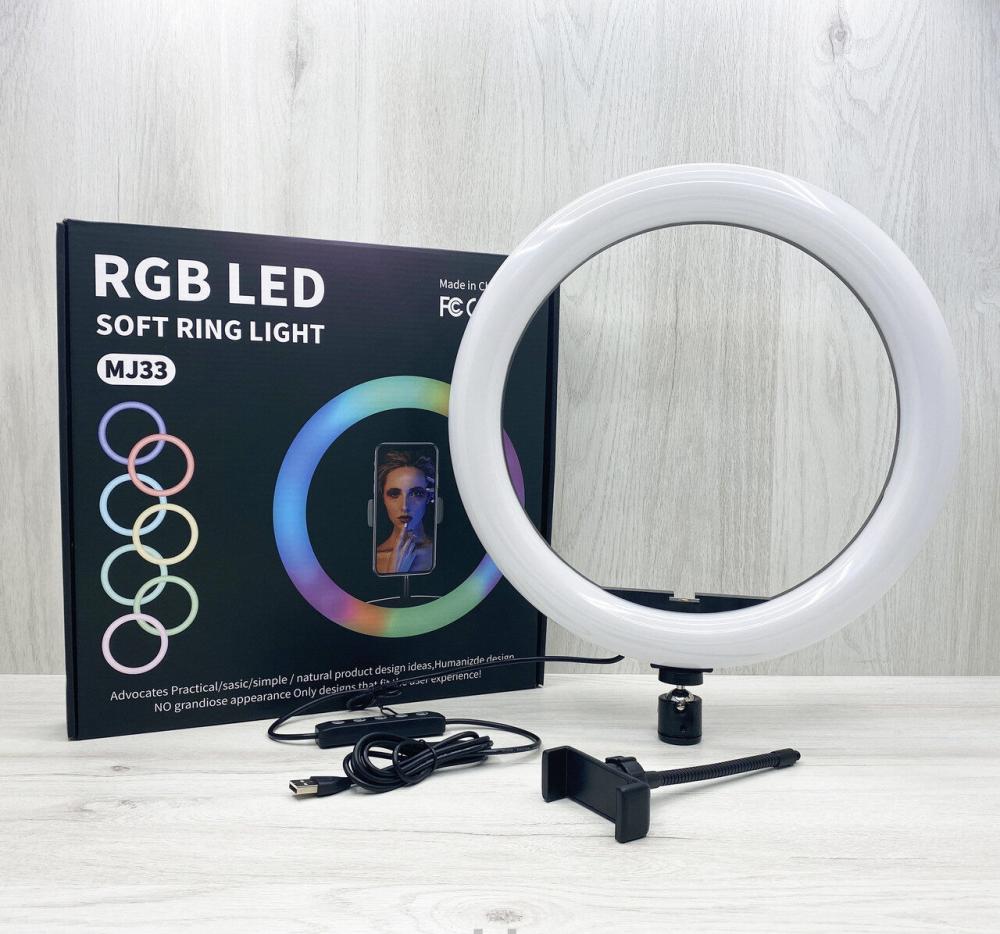 حلقة الإضاءة RGB LED Soft Ring Light موديل MJ33 تتميز بإضاءة ناعمة وبتدرجات الفضاء اللوني RGB، وتأتي بالعديد من الألوان والإعدادات المختلفة.