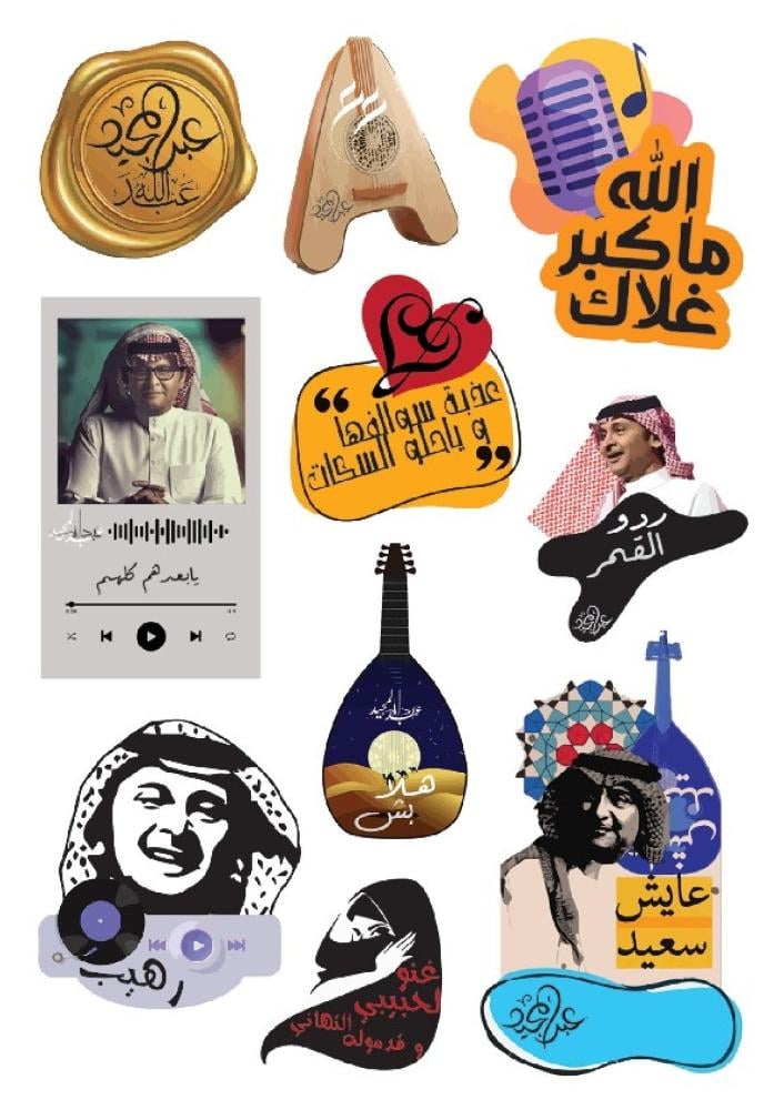 - عناصر تراثية: تتضمن الملصقات عناصر مستوحاة من الثقافة السعودية مثل العود والكاسيت والتصاميم الشعبية.