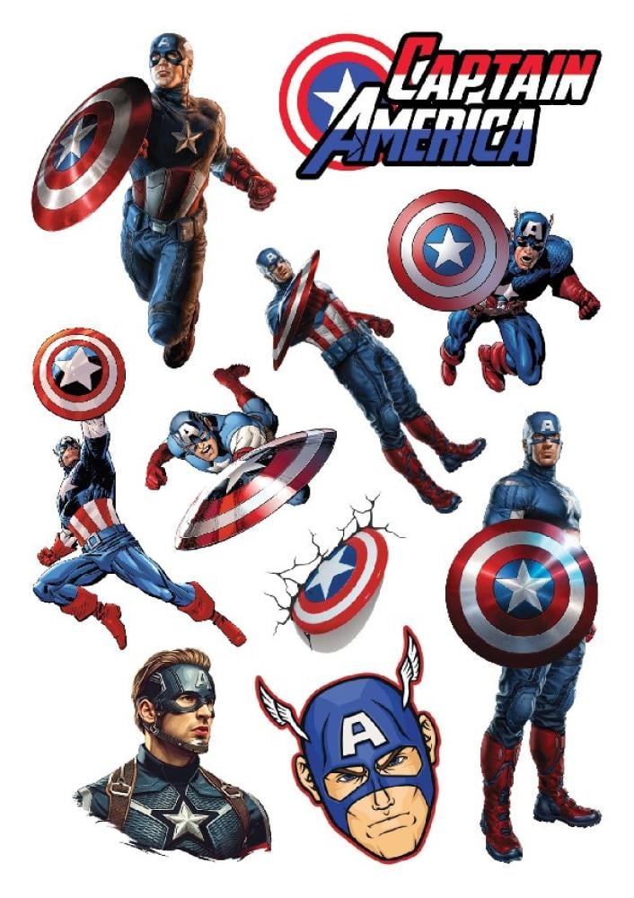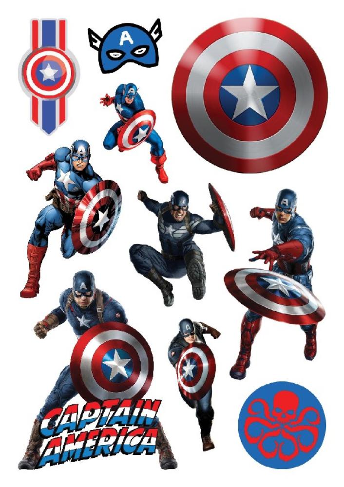 • كابتن أمريكا: الملصقات تعرض شخصية كابتن أمريكا في أوضاع قتالية مختلفة، وهو يستخدم درعه الشهير في الدفاع والهجوم. الدرع يظهر بشكل بارز في معظم الملصقات وهو يحمل نجمة في منتصفه بألوان العلم الأمريكي (الأحمر، الأزرق، والأبيض).