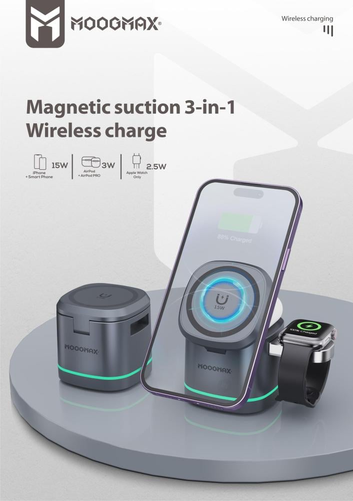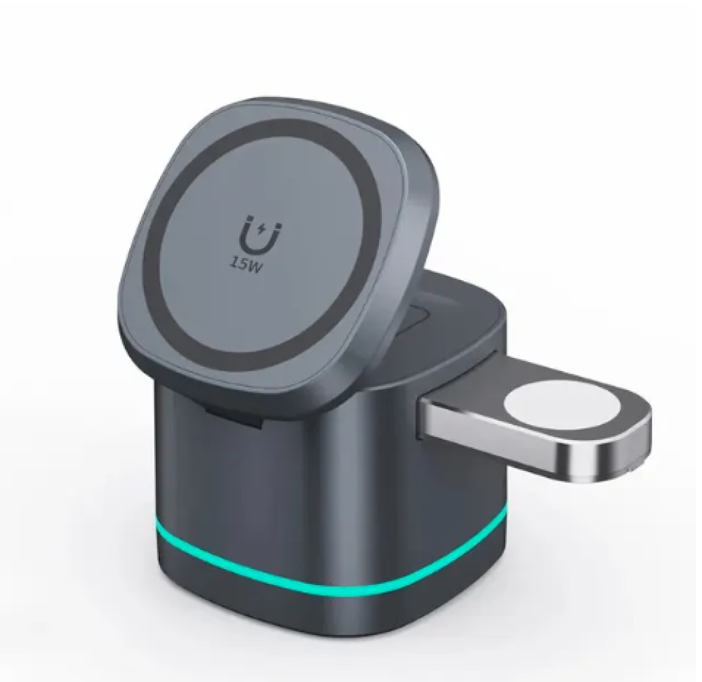 - منصة شحن لاسلكي متعددة الوظائف لشحن أجهزة آيفون وساعة أبل والايربودز .