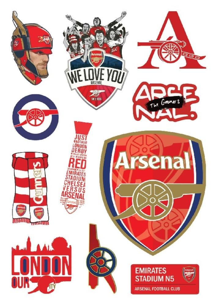 These Arsenal stickers are the perfect addition to any Arsenal fan. Featuring a stylish and eye-catching design, the stickers combine the club's crest, iconic phrases, stadium symbols and icons that represent the club's fans.